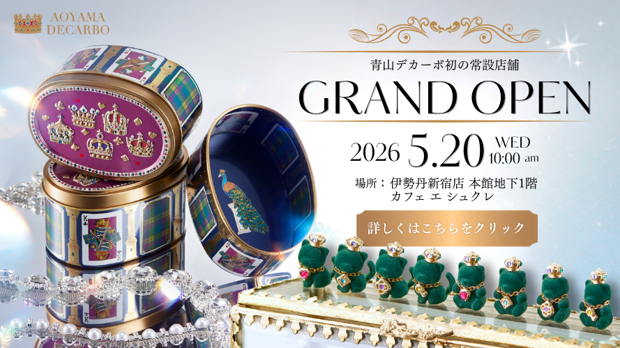 2025年のクリスマスを記念して、青山デカーボから『クリスマスエンブレム缶』が新登場。 伊勢丹新宿店、阪急うめだ本店にて、11月19日(水)から先行販売を開始します。 蓋面には、ガラス絵で描いた『クリスマスのエンブレム』をメインビジュアルに配置し、側面には、ガラス絵のお菓子缶を飾った『アンティーク風の棚』をデザインしました。 今回のとっておきは、覗くとガラス絵が見える『不思議な鍵のチャーム』です。 店頭では『不思議な鍵のチャーム』は全部で3種類からお選びいただけます。 中には、『ハート型のラズベリーのフィナンシェ』が入っています。 【商品詳細】 クリスマス限定『クリスマスエンブレム缶』 不思議な鍵のチャーム1個 グルテンフリーのラズベリーフィナンシェ2個入り 税込2,640円(本体価格 2,400円) ※お一人様につき5点まで 【発売日】 ・2025年11月19日(水)から12月2日(火)伊勢丹新宿店 本館1階 雑貨/イセタンシード (イベントに先駆けて11月12日(水)午前10時から三越伊勢丹オンラインストアにて先行受注 ※MIWメンバー会員さま限定) ・2025年11月19日(水)から12月2日(火)阪急うめだ本店 9階 祝祭広場「クリスマスマーケット2025」 ・2025年12月10日(水)から12月16日(火)銀座三越 本館地下2階 ギンザスイーツパークI ※無くなり次第終了となります。品切れの際はご容赦ください。 ※お取り置きやご予約は承っておりません。 ※イベントの内容は、都合により変更または中止となる場合がございます。予めご了承ください。