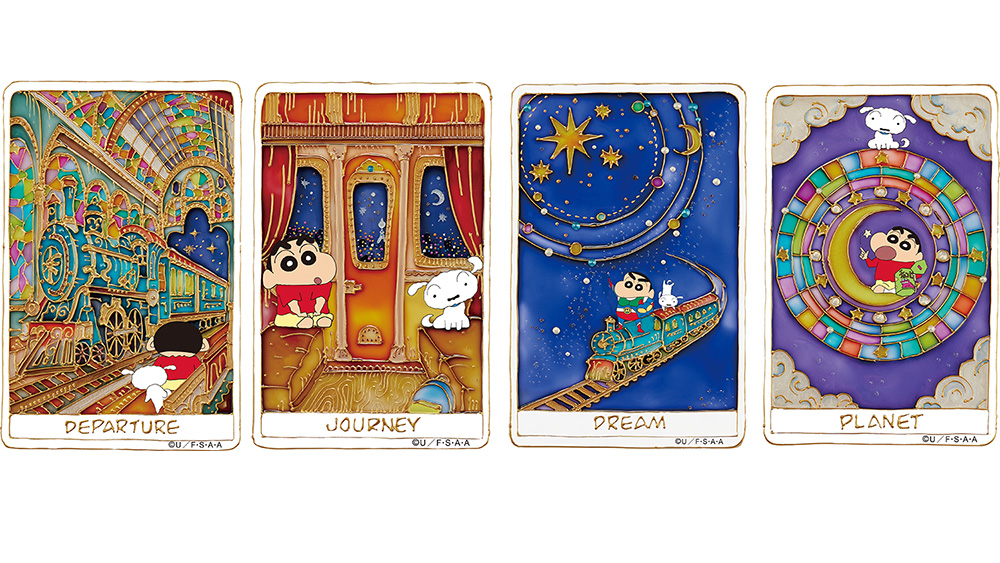 しんちゃんとシロがふたりで魔法の列車に乗り、旅をしている様子がカードのデザインで描かれています。