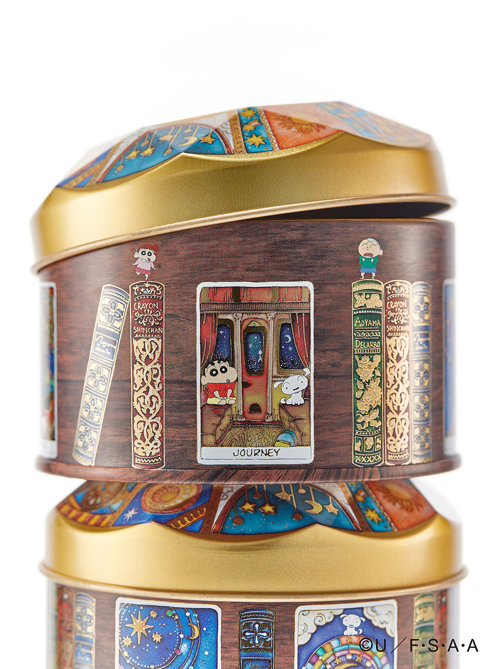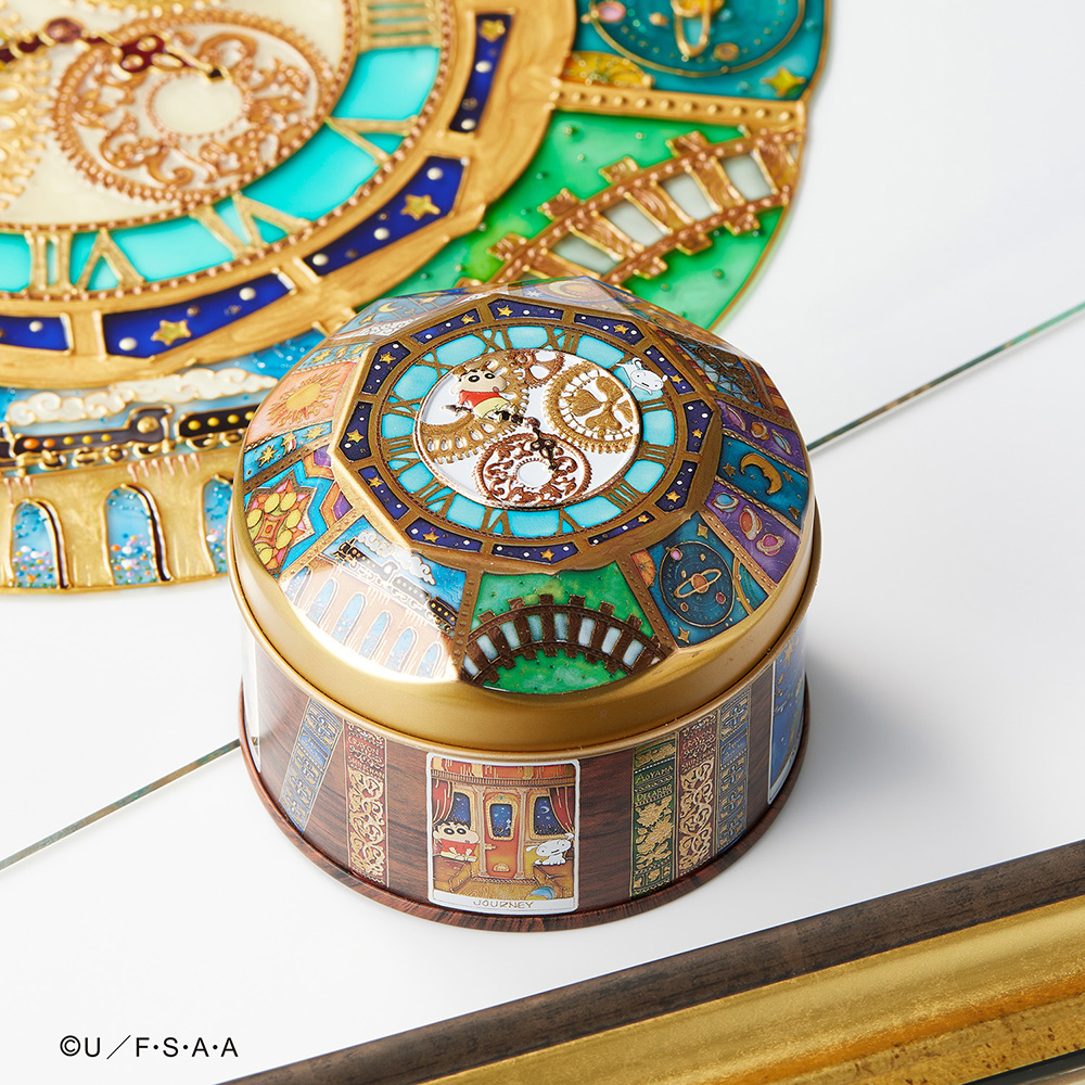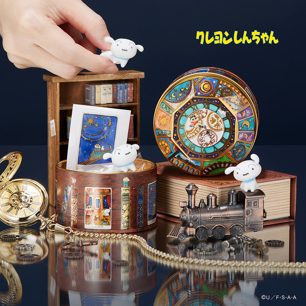 蓋面には、アンティーク風な歯車時計をデザイン。中央には、ミニチュアのしんちゃんとシロが遊んでいる様子が描かれています。