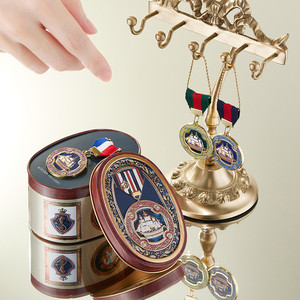 缶を開けると現れる、缶のデザインと同じアンティークのような『メダル』